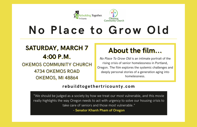 Rebuilding Together Tri-County is excited to invite you to a special screening of No Place To Grow Old. While this powerful documentary delves into the growing crisis of senior homelessness in Portland, Oregon, it is relevant to the greater Lansing area.